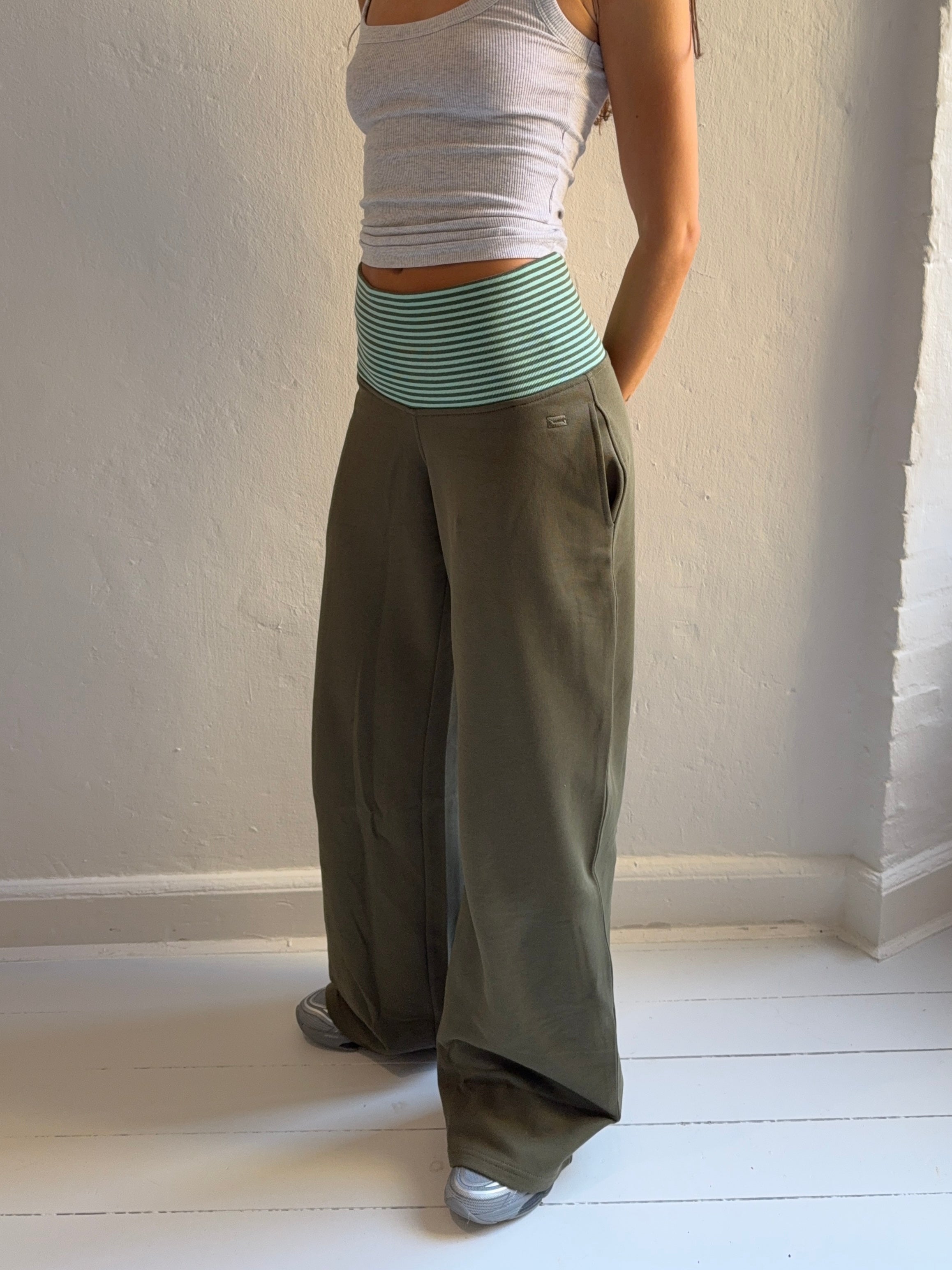 · ribbed high waistband with light green stripe detailing · wide-leg silhouette · sweat fabric