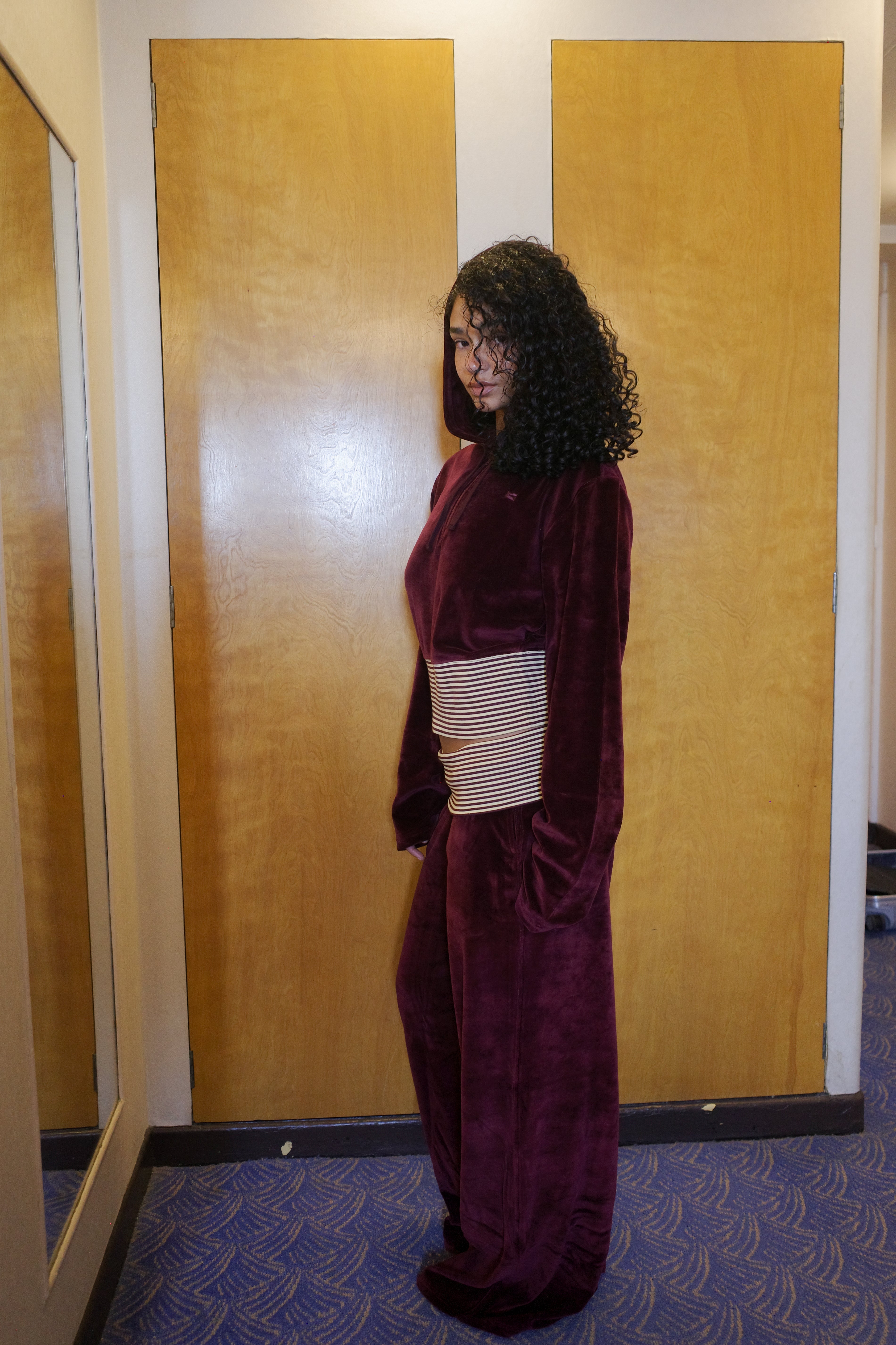 High ribbed waistband with yellow striped detailing · wide-leg silhouette · velvet fabric