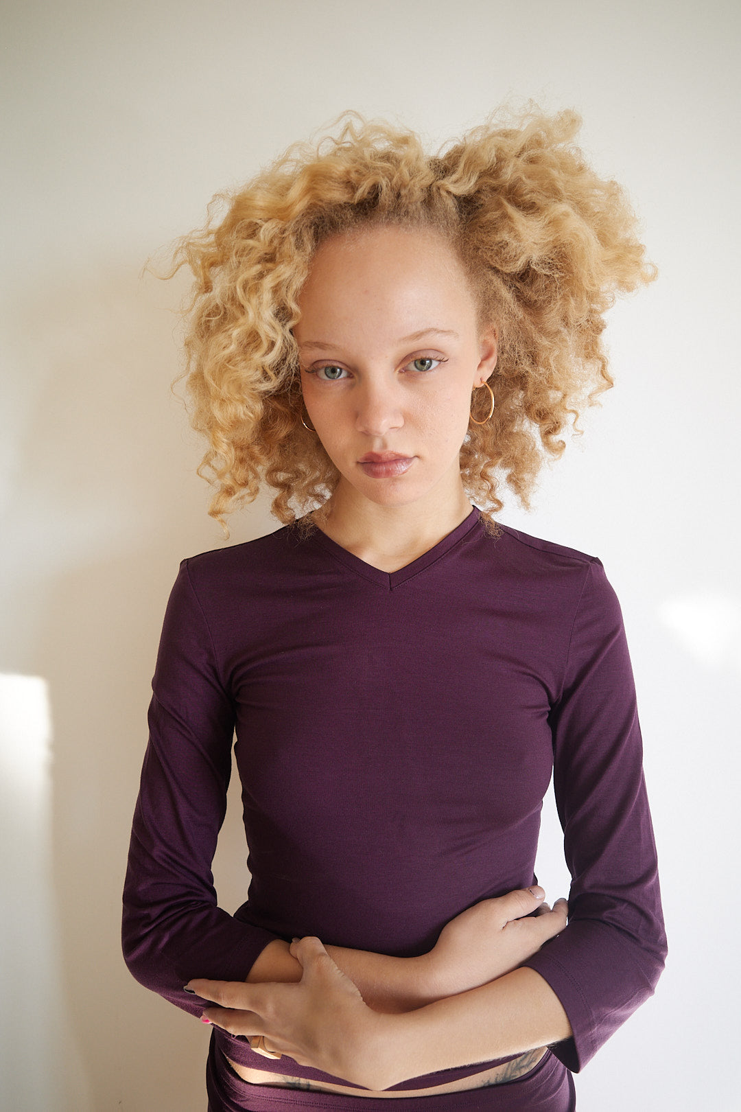 · matte viscose jersey · fitted silhouette · sharp v neckline · soft drape · clean hem with tonal embroidery