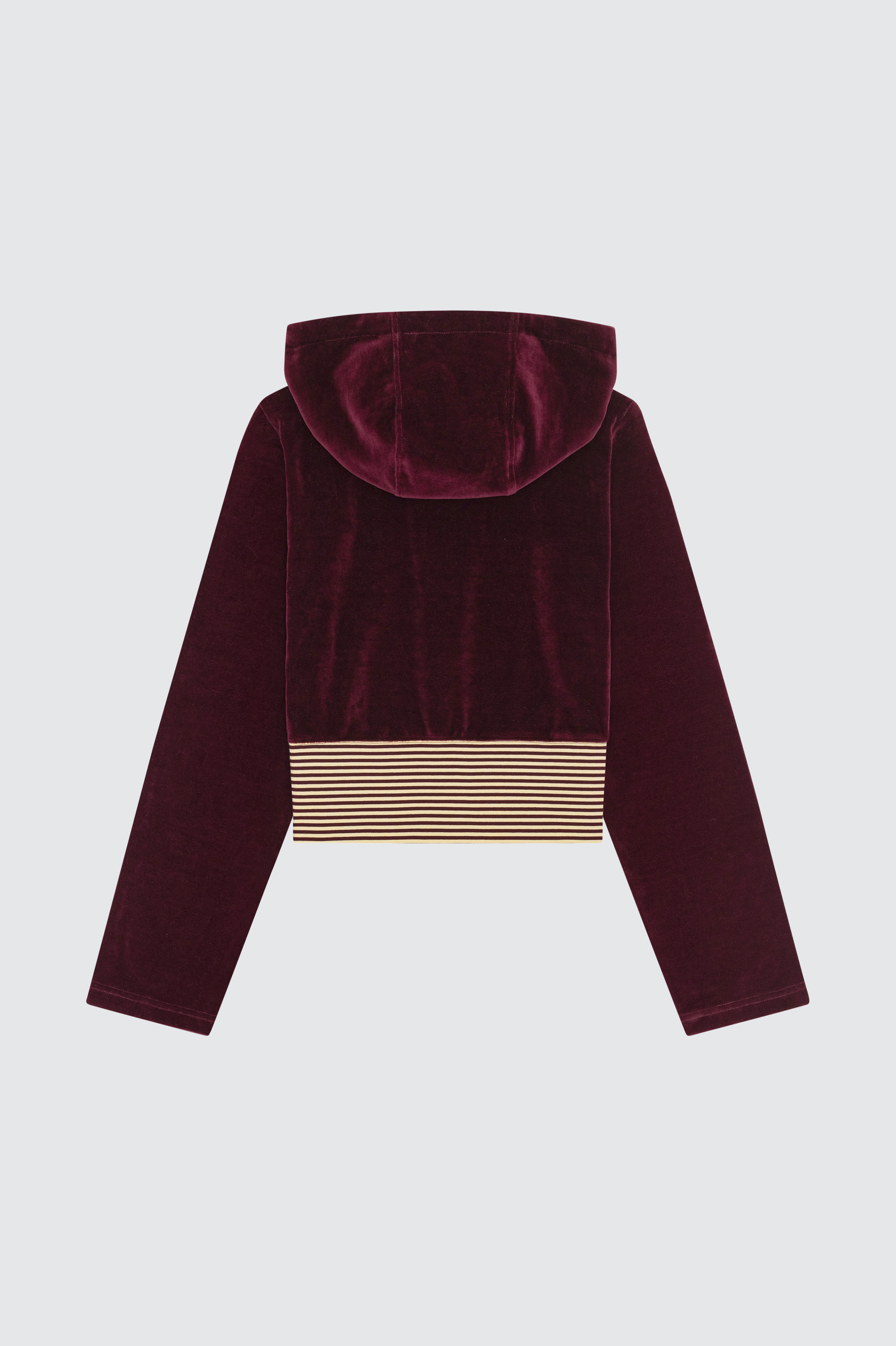 Cropped silhouette · half-zip front · adjustable hood with drawstrings · long wide sleeves · soft velvet fabric