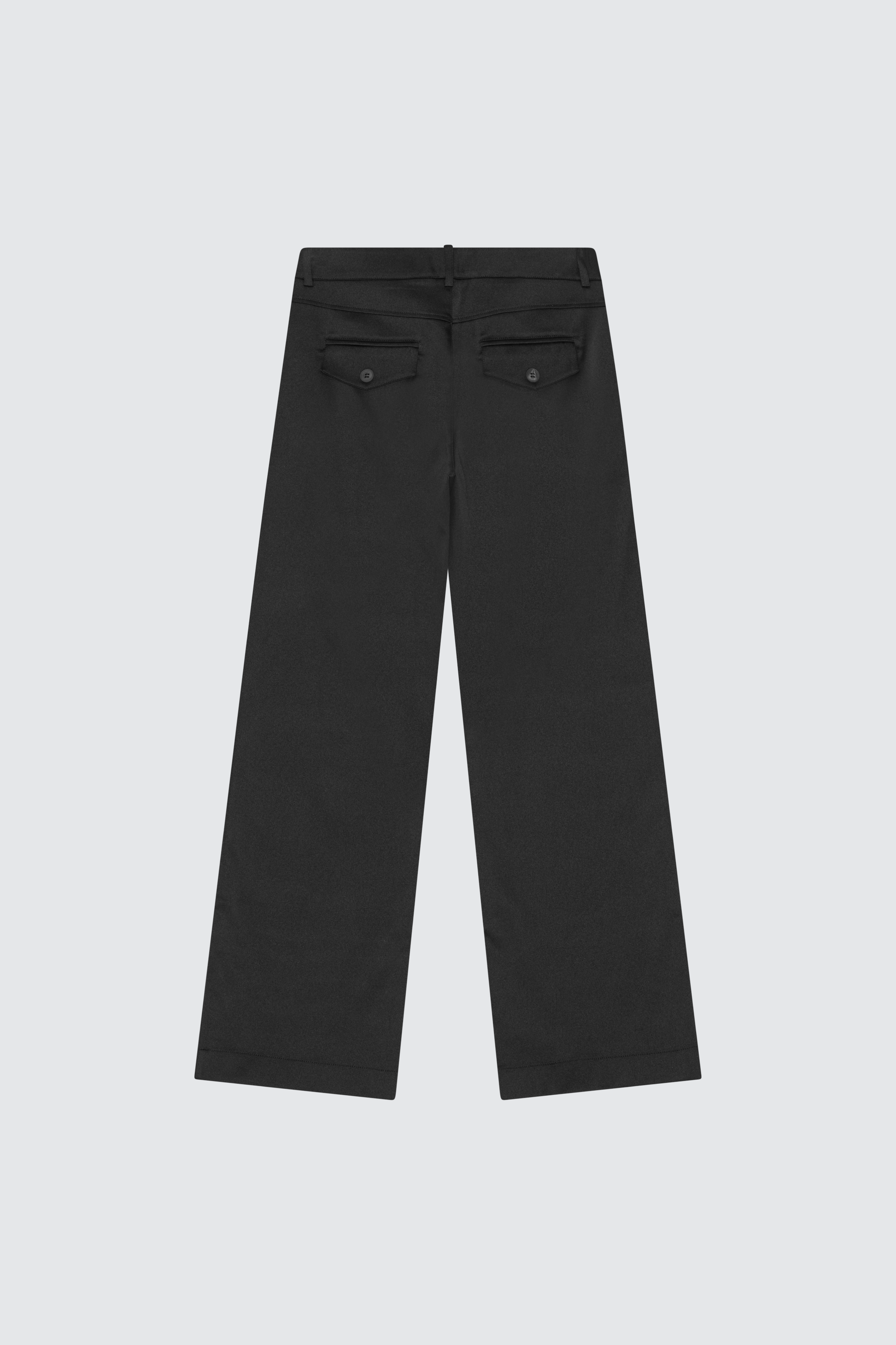 · heavy satin · double-layer waistband with fly closure · belt loops and welt pockets · straight leg · tonal topstitch details · embroidery at front