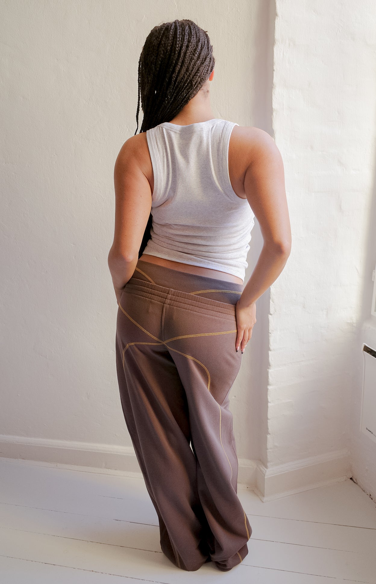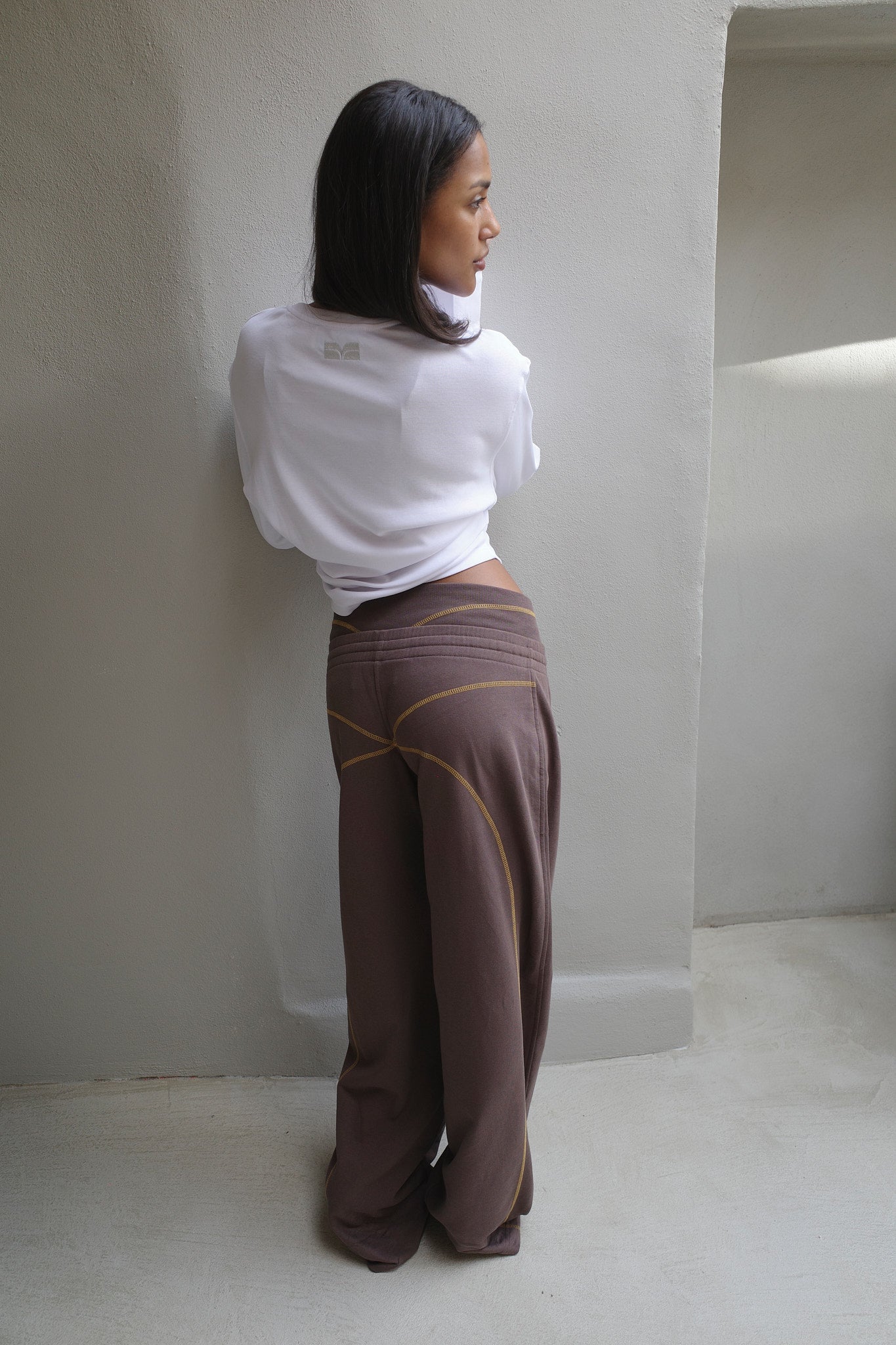 · cotton sweat jersey · double waistband · barrel-shaped leg · tonal flatlock seams · mandarin yellow contrast stitching